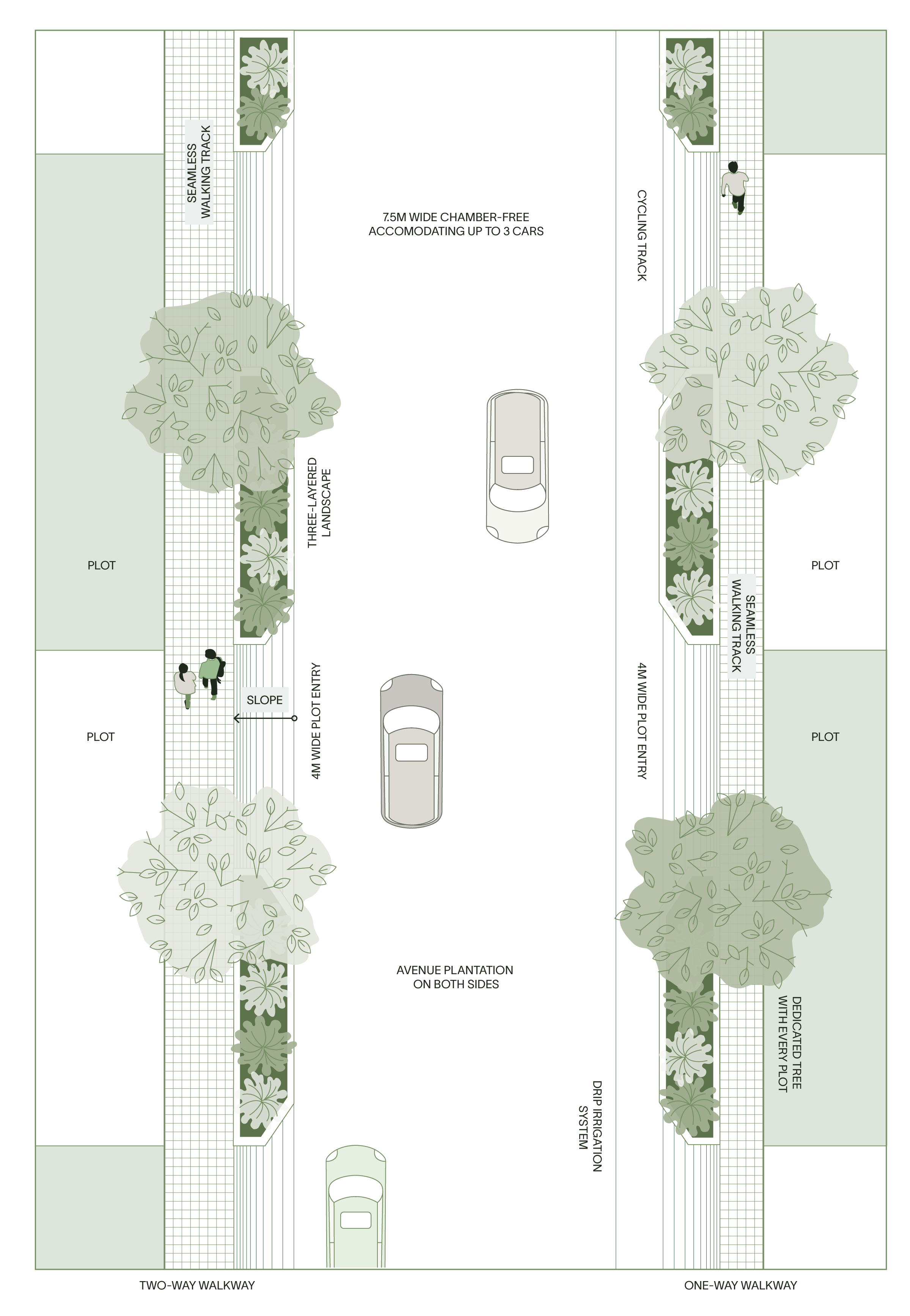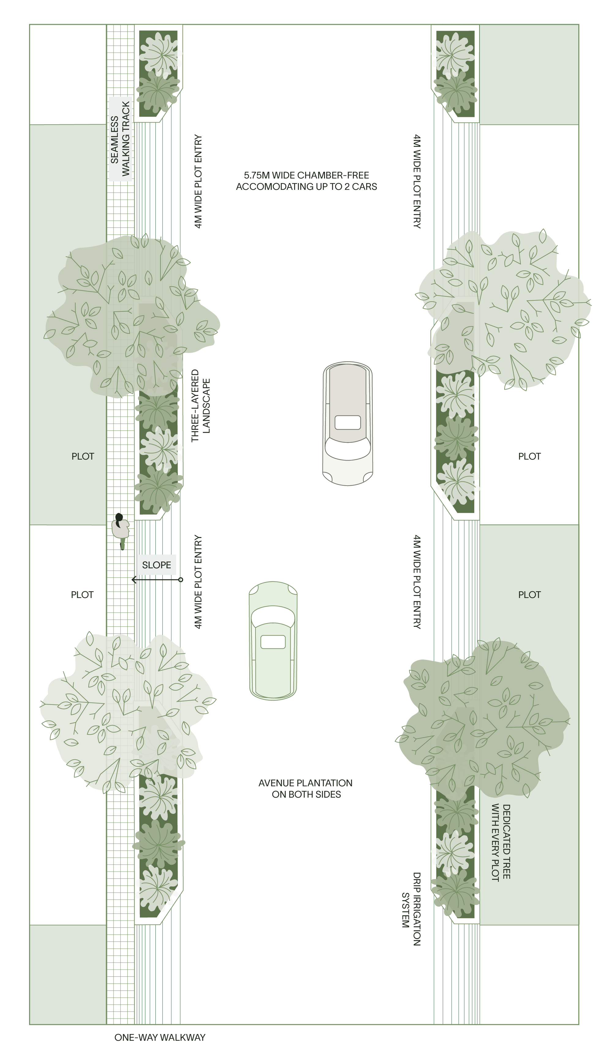 Avenue plantation on both sides of the road designed to accommodate larger trees for enhanced privacy.